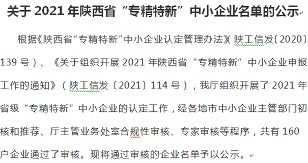 目前,專精特新“小巨人”企業(yè)的榮譽(yù)證書因疫情原因暫未發(fā)放到位,但是,國家工信部已將此評(píng)選結(jié)果發(fā)送至國家科技局、陜西省科技廳、西安市科技局,以及陜西省、西安市各大職能部門。